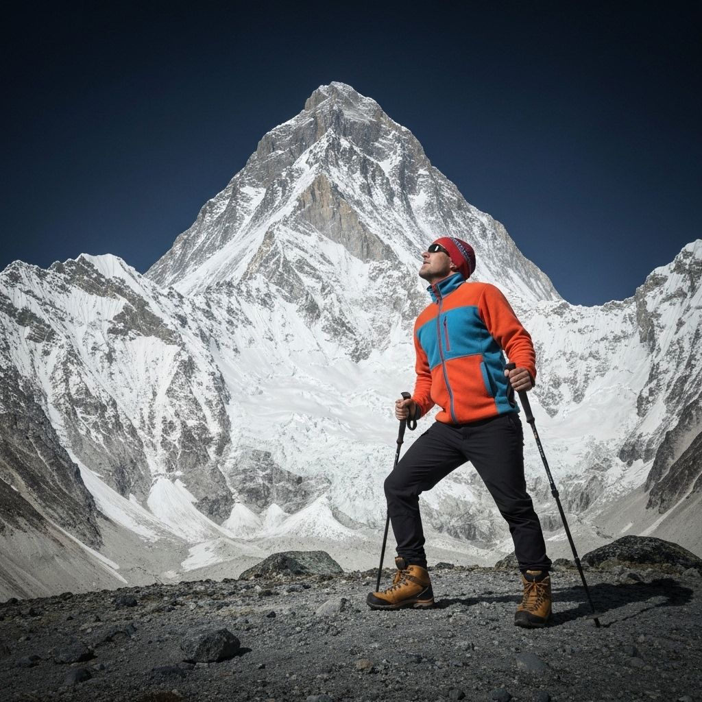 Climber at the foot of a great mountain